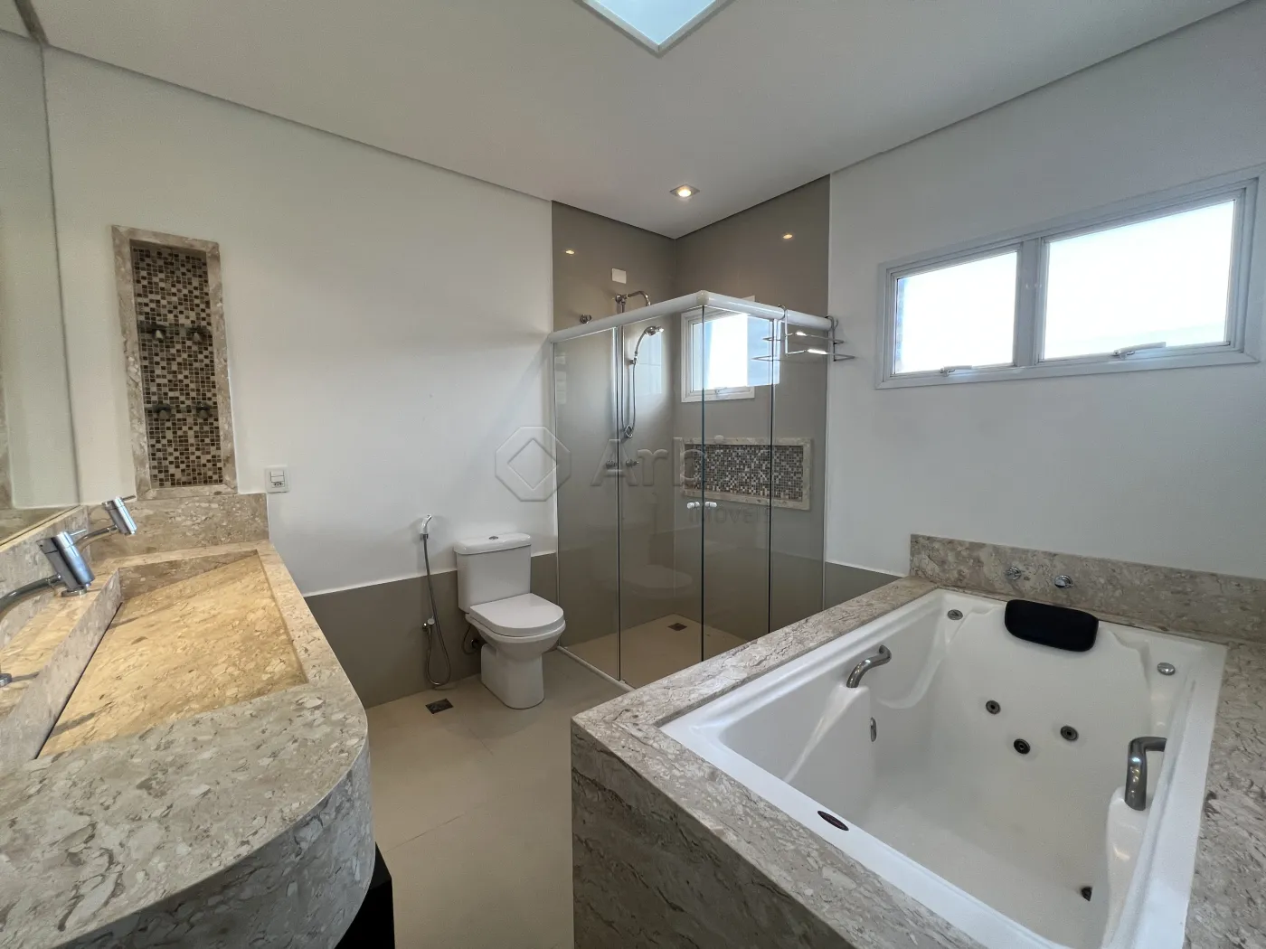 > 03 dormitórios sendo 01 térreo com suíte e 02 na parte de cima com suíte, sendo 01 máster com closet, hidromassagem e sacada.
