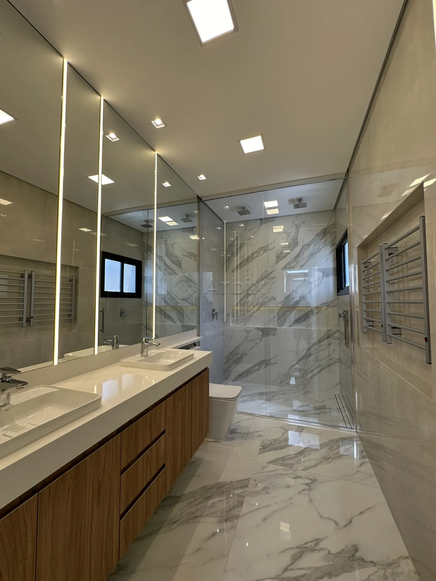 > 06 banheiros, sendo 01 lavabo e 01 externo para atender a piscina, todos os banheiros com secador de toalhas elétrico e box ate o teto.;