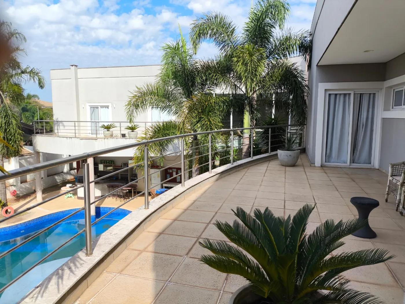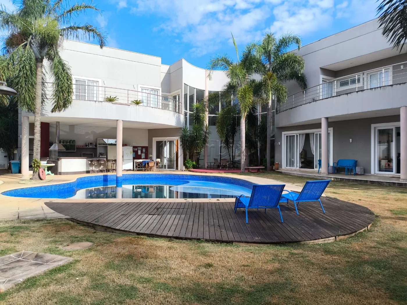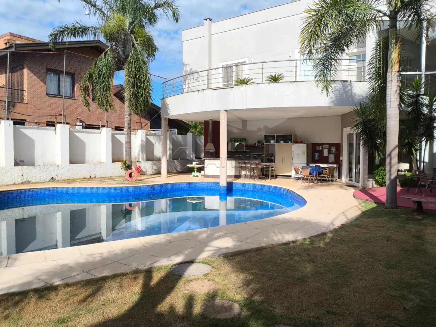 Sua área externa é completa, possuindo um espaço gourmet com churrasqueira e planejados, piscina grande e extenso quintal gramado.
