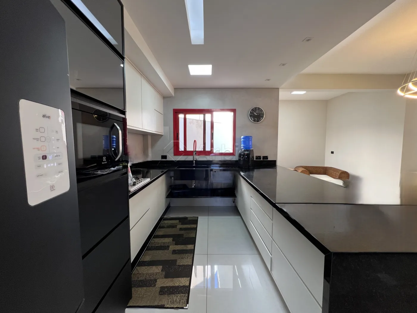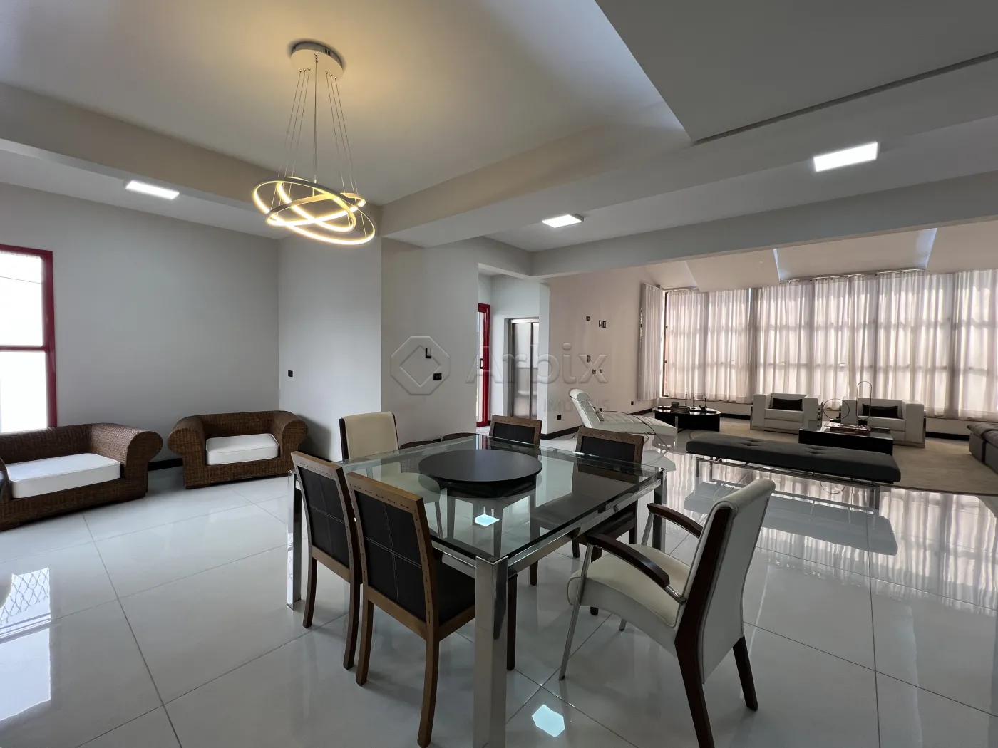 A área social é marcada por uma imponente sala de estar com pé-direito alto, conectada à sala de jantar e à cozinha totalmente planejada e equipada, formando um ambiente fluido e elegante.