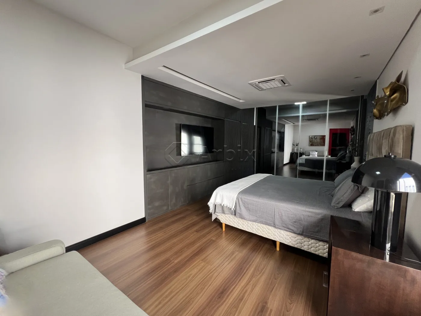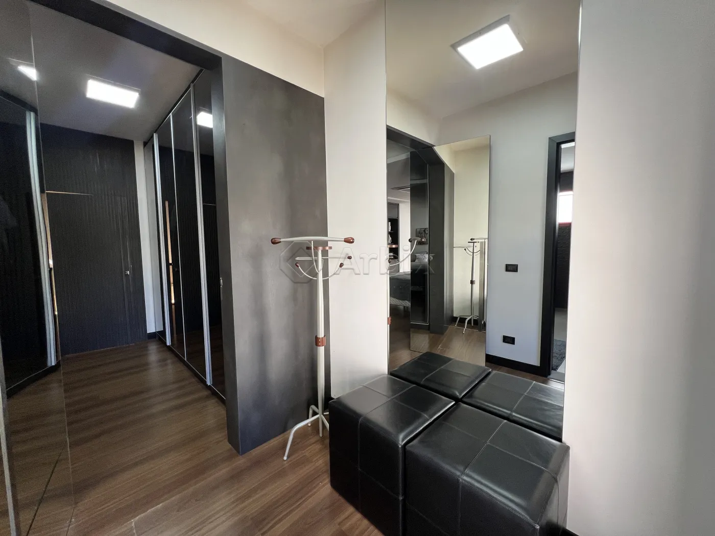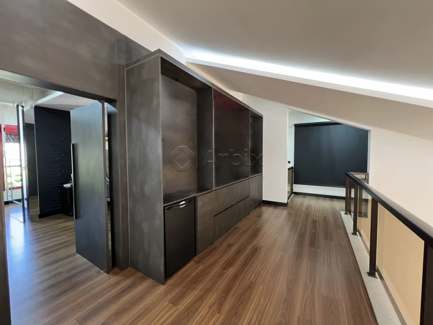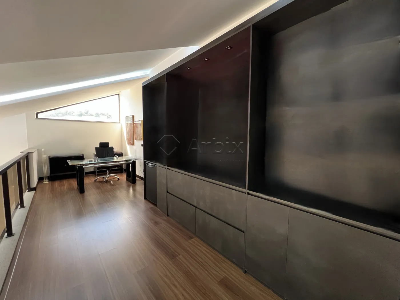 No piso superior, um mezanino abriga um escritório reservado, com acesso direto à suíte, proporcionando um espaço íntimo e versátil.