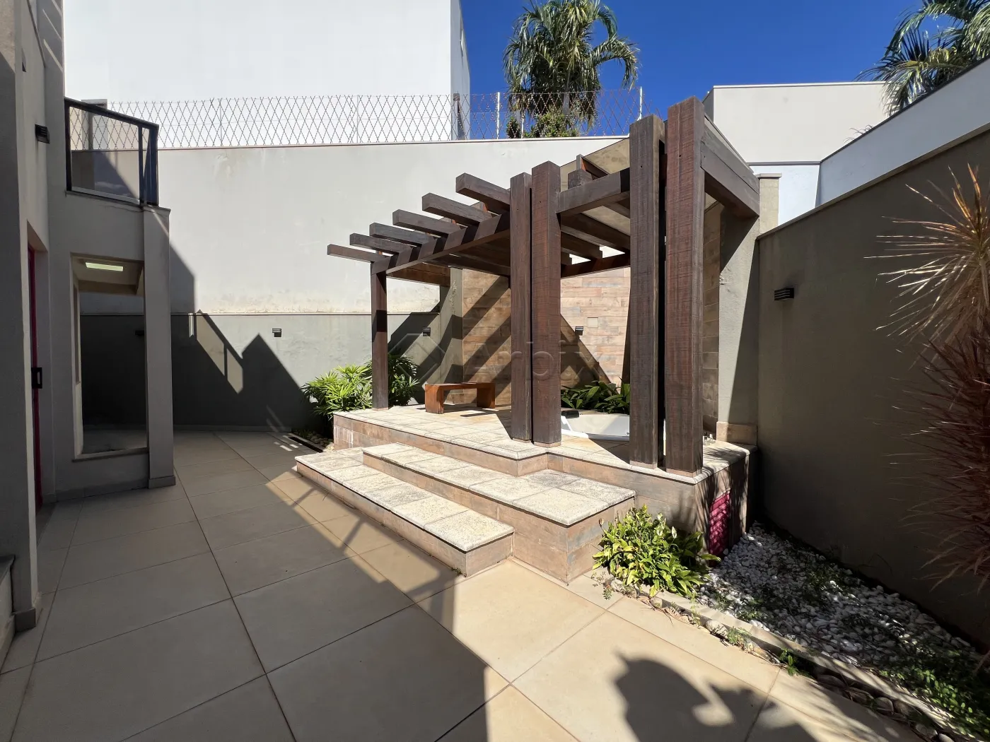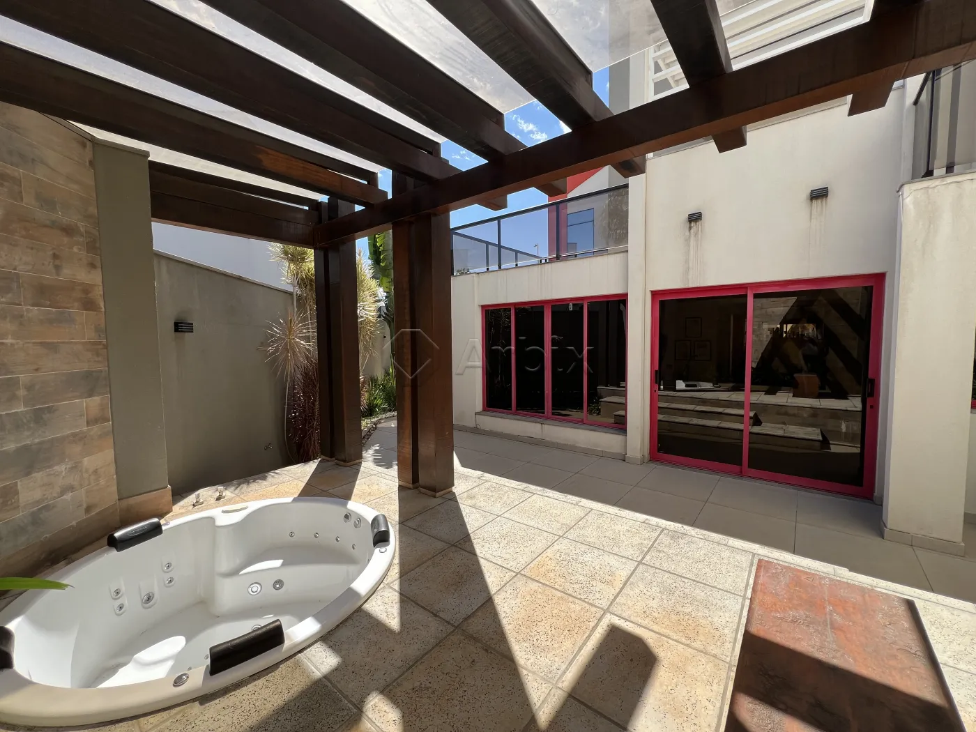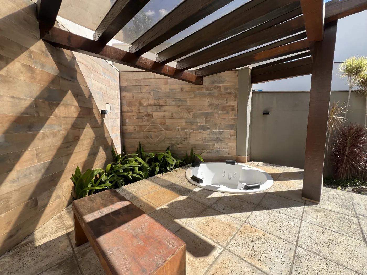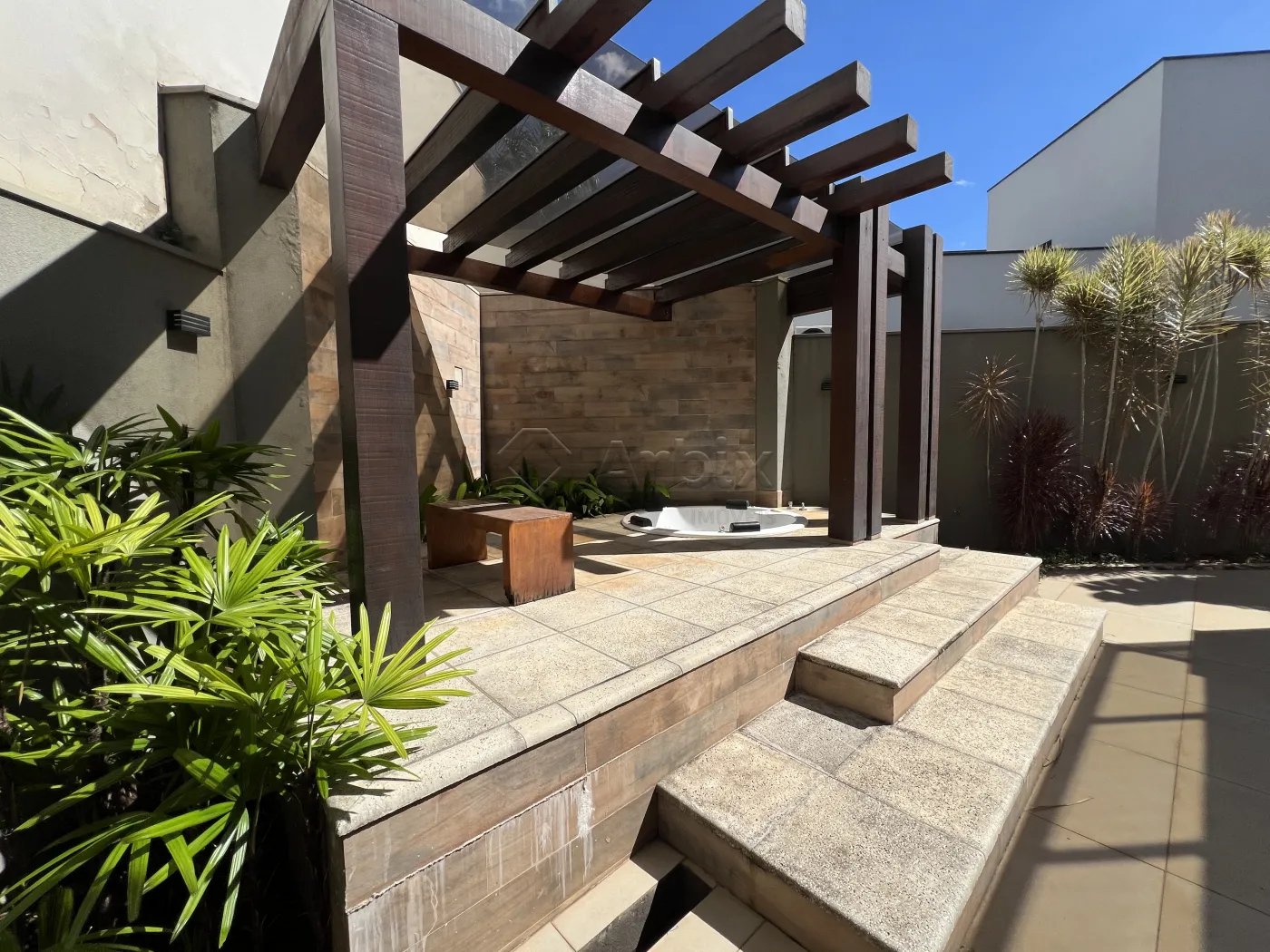 Na área externa, o imóvel dispõe de um amplo quintal e um sofisticado pergolado em madeira com jacuzzi, criando um refúgio privativo para momentos de relaxamento.
