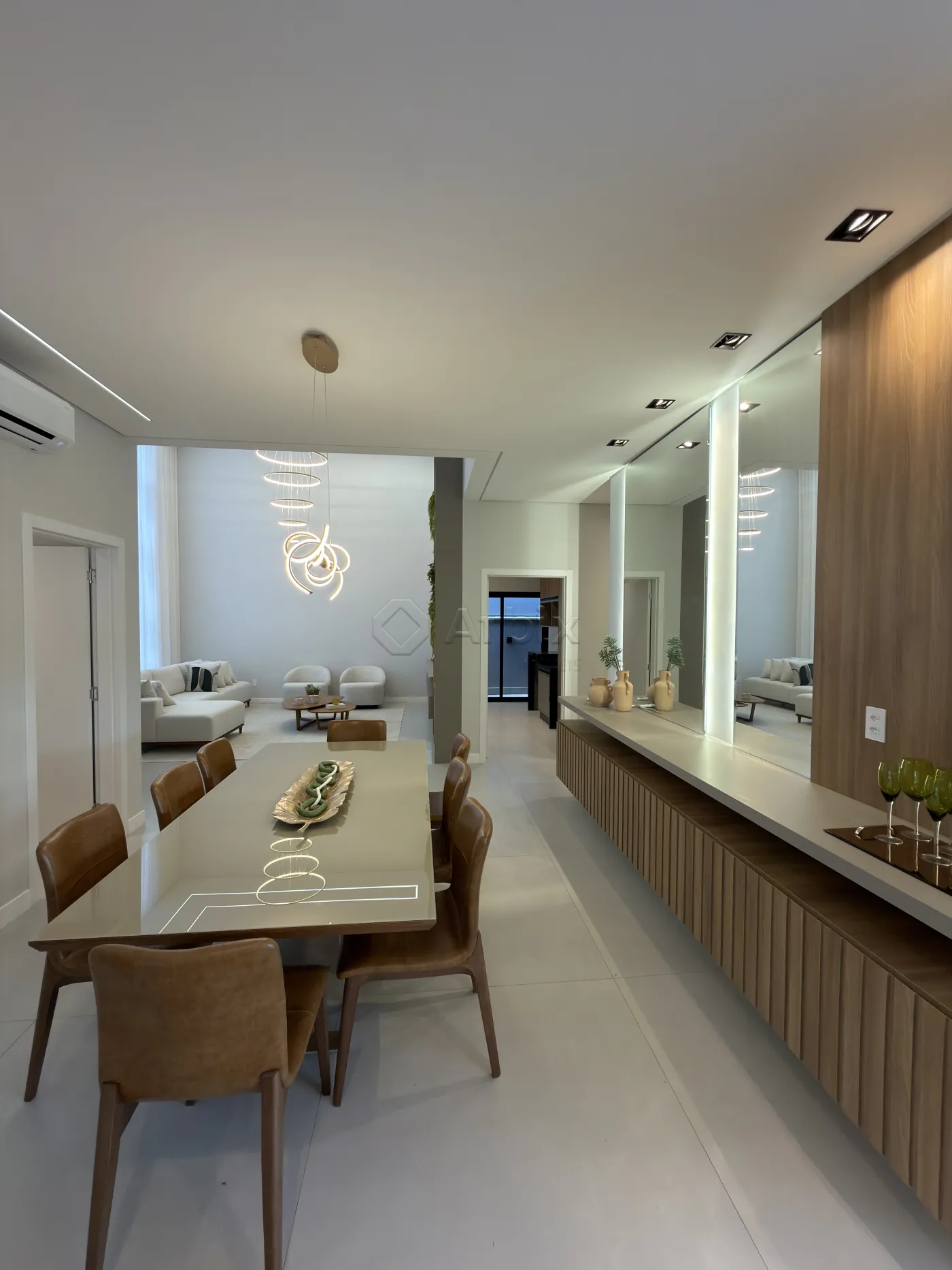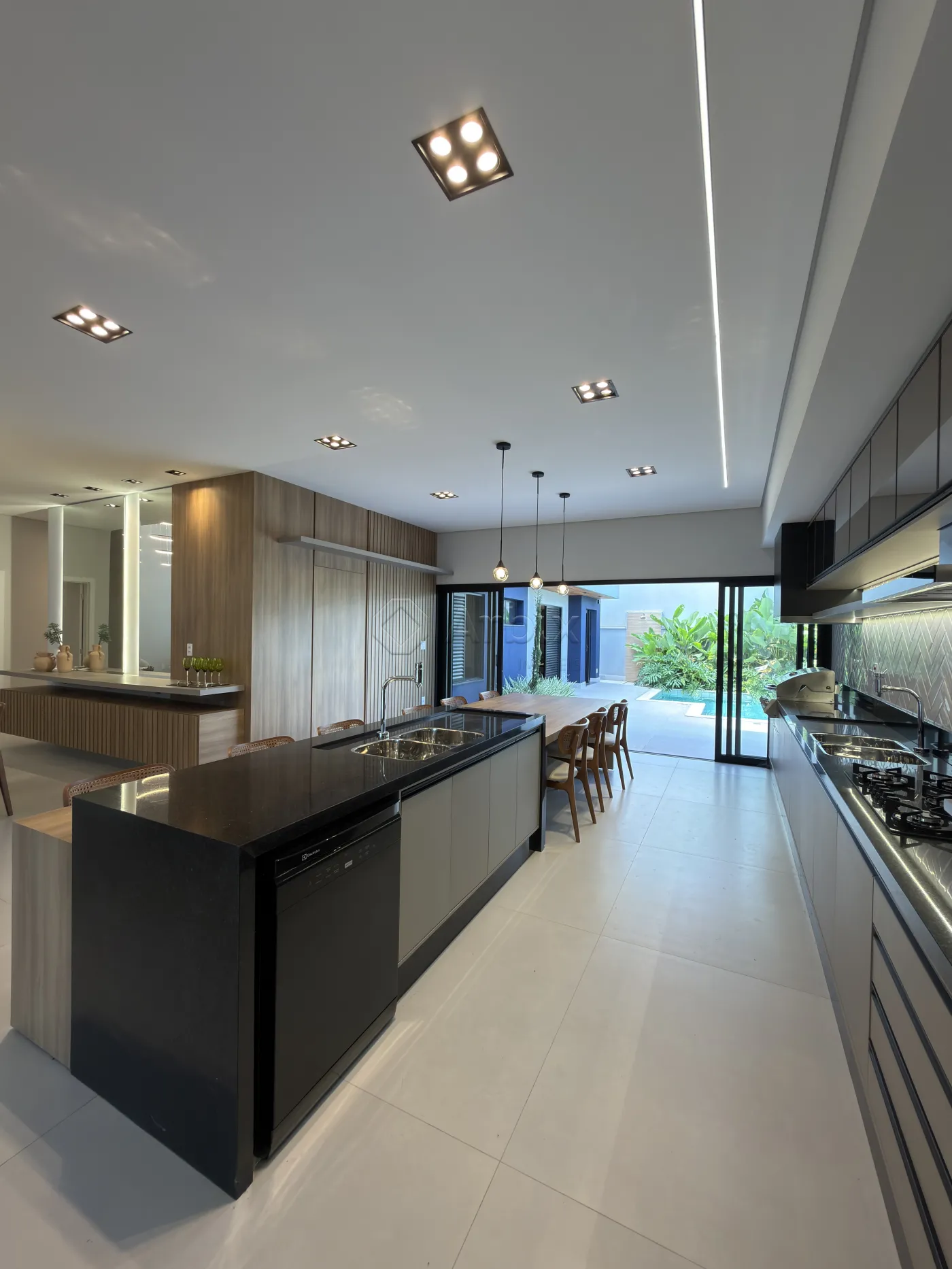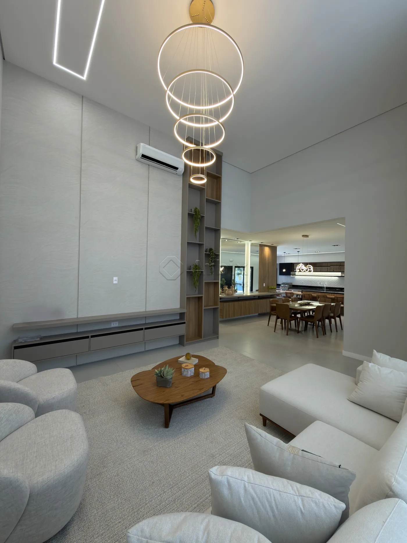 Com 450m² de terreno e 276m² de construção. A sala de estar com pé-direito alto, cozinha gourmet totalmente planejada, equipada com churrasqueira, cooktop, forno e bancada.