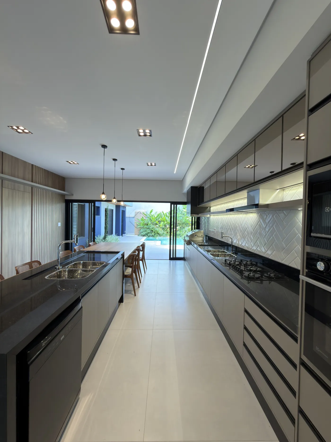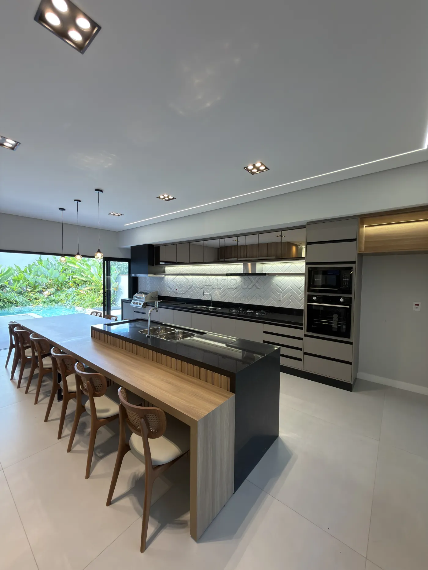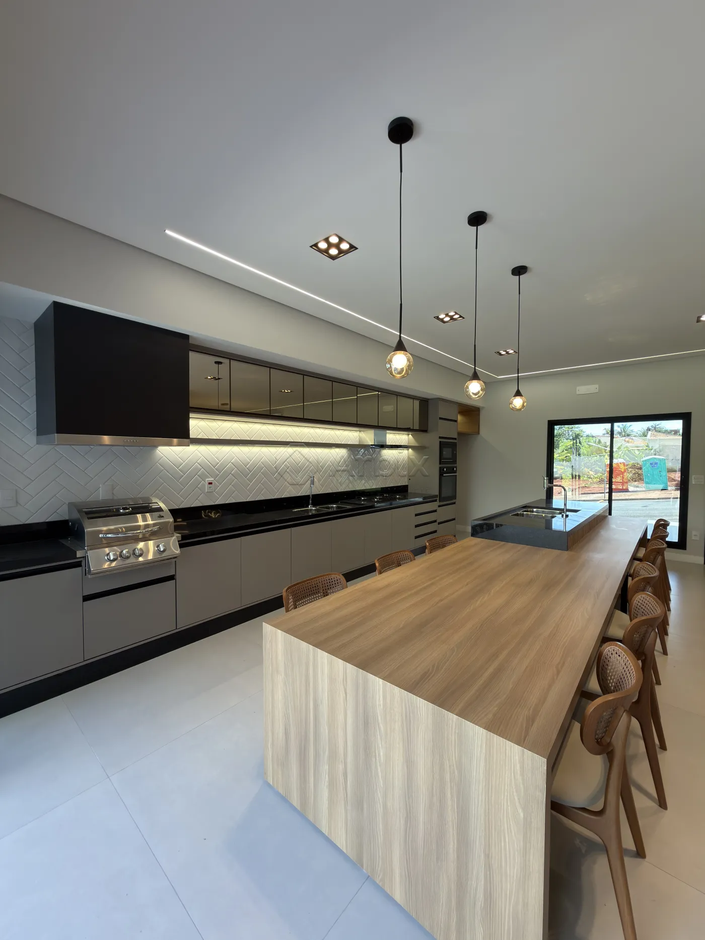 Com 450m² de terreno e 276m² de construção. A sala de estar com pé-direito alto, cozinha gourmet totalmente planejada, equipada com churrasqueira, cooktop, forno e bancada.