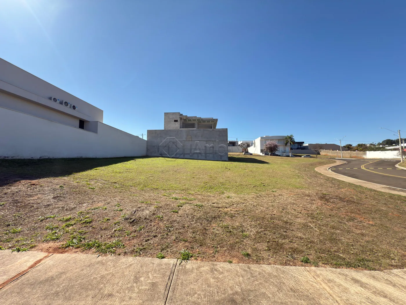 Este terreno de esquina conta com 780M², oferecendo uma extensa área plana e gramada, contando com calçada e possuindo outras construções ao redor.