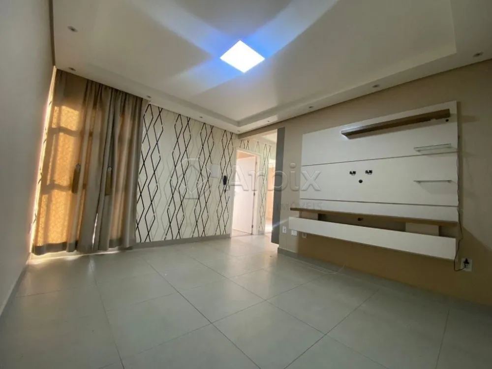Possui acabamento em piso frio, sala com cortinas sob medida e sanca de gesso com spots embutidos.