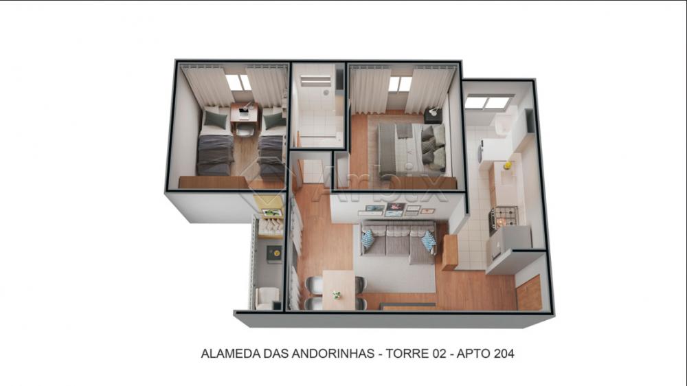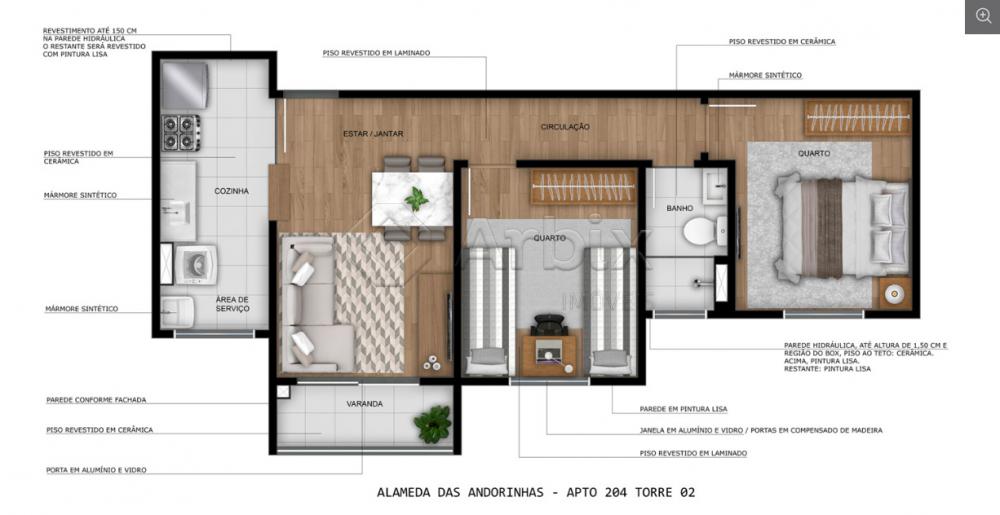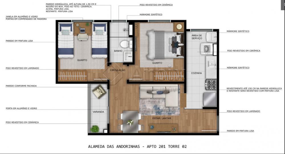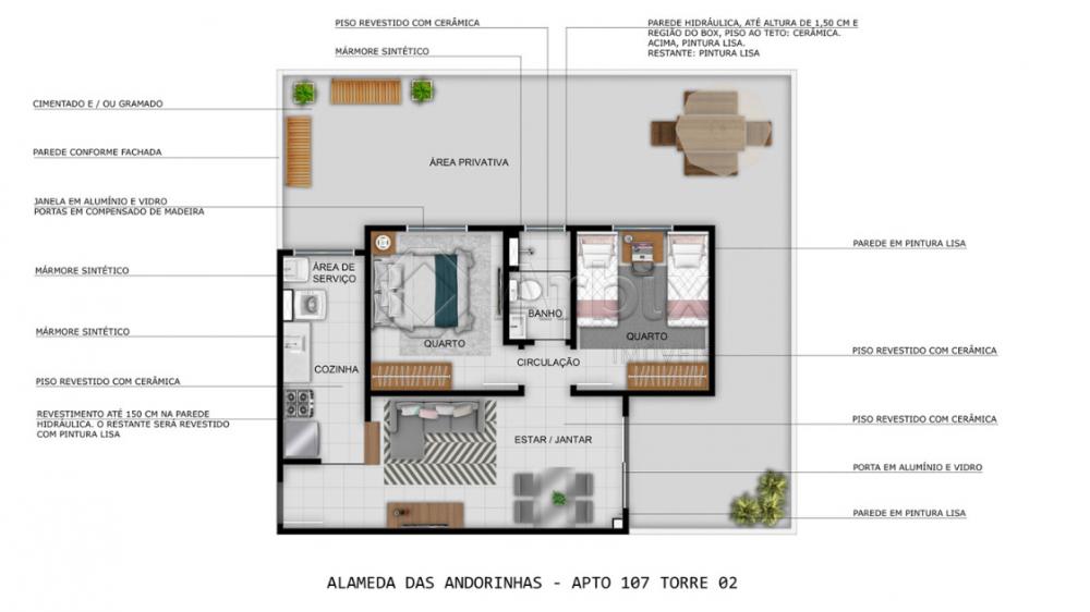 Os apartamentos do Alameda das Andorinhas conta com sala de estar e jantar integradas, cozinha conjugada com a área de serviço, varanda (opcional), área privativa (opcional), 02 dormitórios (opcional) e 01 banheiro social.